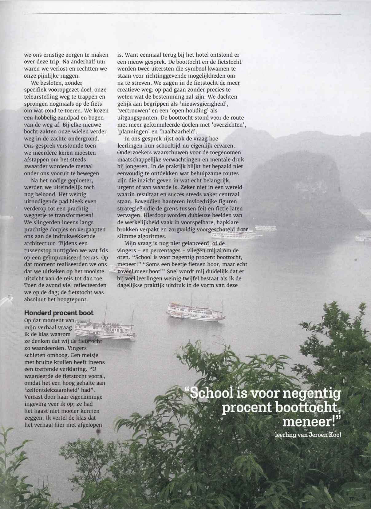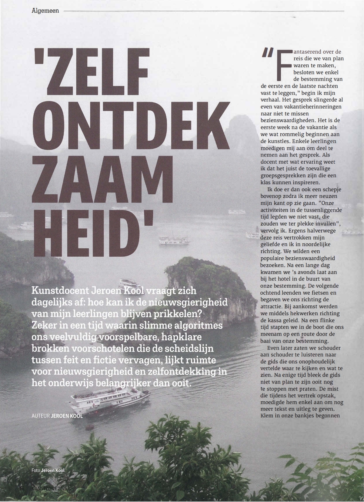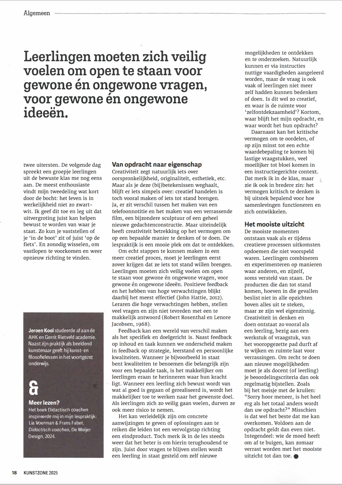 Kunst -en filosofiedocent Jeroen Kool vraagt zich dagelijks af: hoe kan ik de nieuwsgierigheid van mijn leerlingen blijven prikkelen? Zeker in een tijd waarin slimme algoritmes ons veelvuldig voorspelbare, hapklare brokken voorschotelen die de scheidslijn tussen feit en fictie vervagen, lijkt ruimte voor nieuwsgierigheid en zelfontdekking in het onderwijs belangrijker dan ooit.